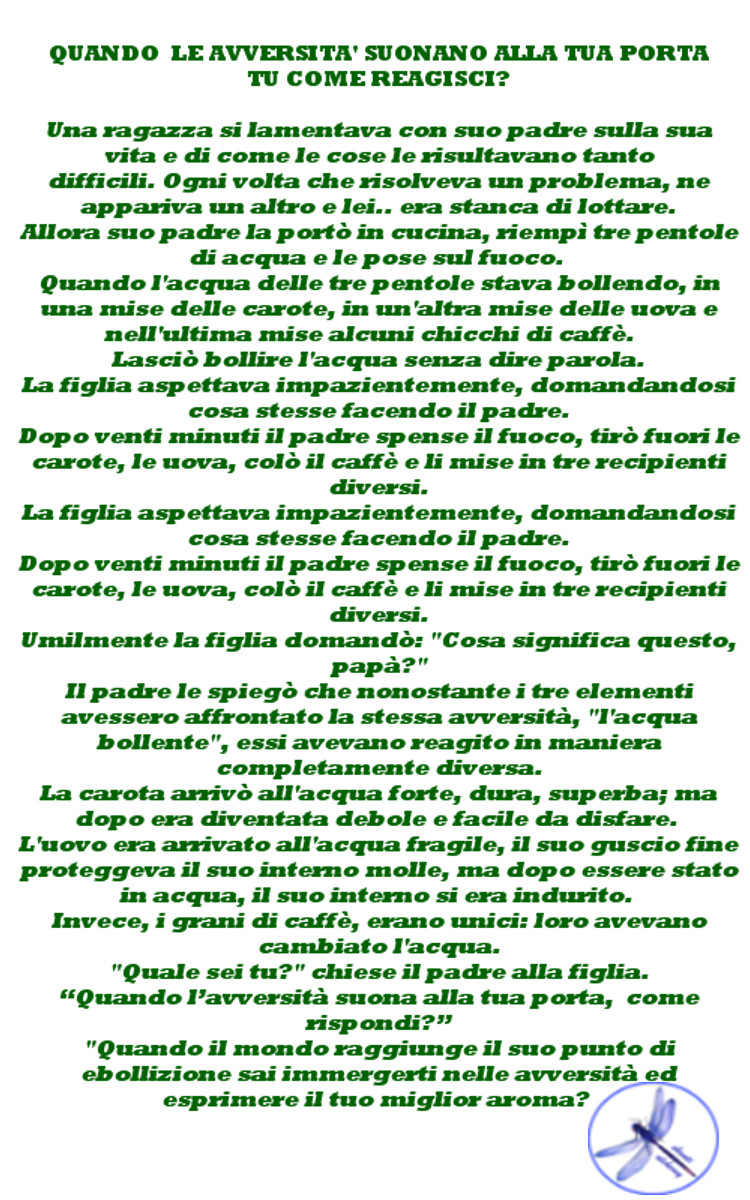 Questa bella storia mi ha fatto ricordare come qualche anno fa ho risposto alla stessa domanda …allora ero agli inizi del mio cammino di consapevolezza e ancora non ero pronta come oggi ad accogliere le avversità, a prendere il meglio della vita cercando di trovare tutte le possibilità positive per affrontare le brutte sfide, a difendere i miei valori, conquistare la mia autostima e rispettarmi.